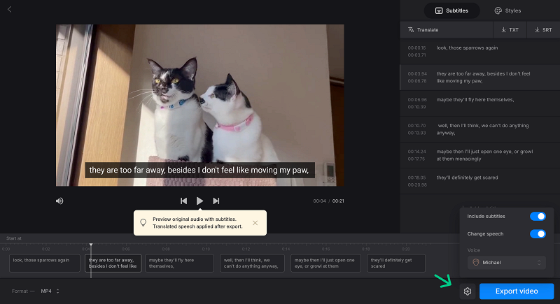 To additionally create an AI voiceover, open the settings (the gear icon) at the bottom and make sure the "Change speech" toggle is on. Choose the AI voice for reading subtitles in a different language instead of the initial one.
